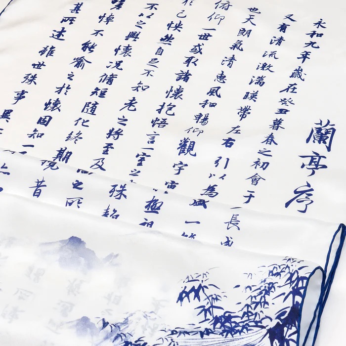 Chiếc khăn lụa Lan Đình Tập Tự của chúng tôi thể hiện nội dung bài thơ của Vương Hy Chi với màu sứ trắng xanh truyền thống. Làm viền xung quanh bài thơ là cảnh quan cổ điển miêu tả núi sông hữu tình. Chiếc khăn sẽ là một phụ kiện hoàn hảo để khẳng định sự tinh tế trong phong cách của bạn.